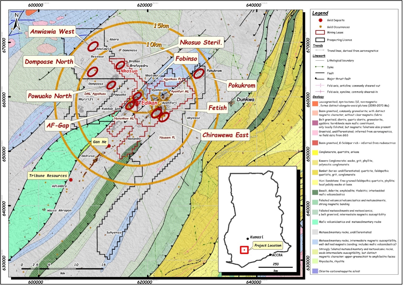 Edikan holds a total of 425.56 sqkm land, all located within the Kumasi Basin close to the western margins of the Ashanti Belt this includes 2 mining leases and 5 Exploration permits. Near mine environment relatively mature in terms of exploration history but increases in gold price present new opportunities. Exploration program at Edikan is focusing on targets within trucking distance of Edikan with potential to increase life of mine. Exploration is focused on generating and then testing mineralised intrusive bodies within structural corridors.