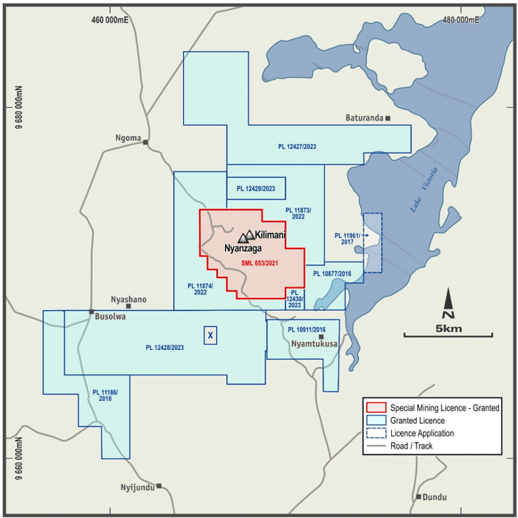 The Nyanzaga Gold Project consists of one Special Mining Lease (SML), nine granted prospecting licences, and one prospecting licence application. The primary focus for the past year and in the coming year will be resource development activities designed in further defining and derisking the resource and will include resource reserve infill drilling as well as geotechnical, metallurgical and site sterilisation drilling and associated technical studies.