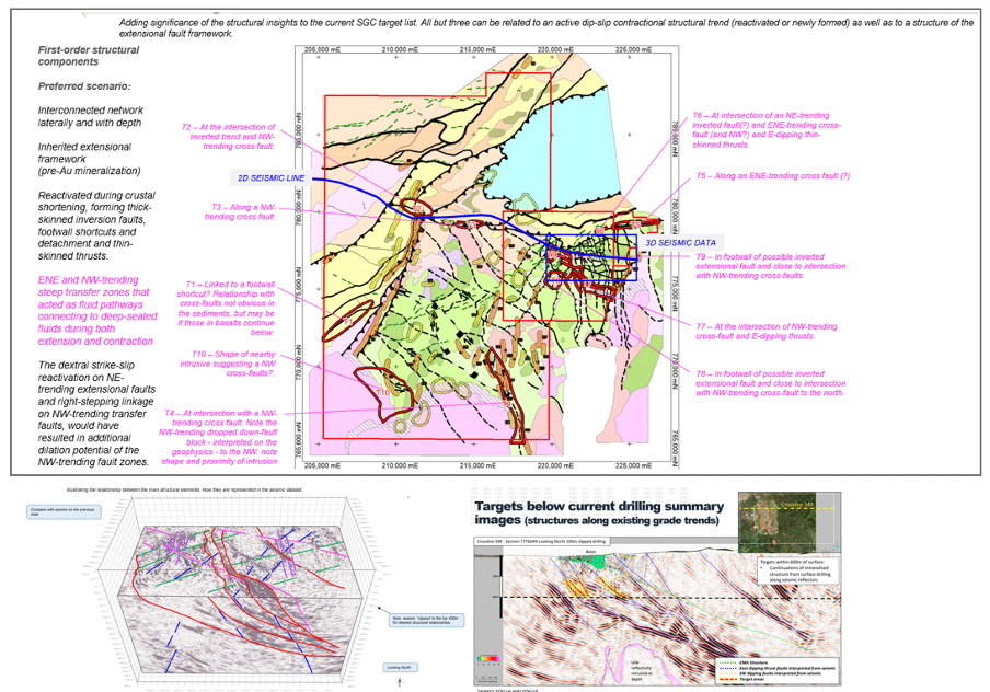 A series of different faulting sets has been recognised across the Nyanzaga project area. These include observed outcrop positions with suggested sinistral movement; others with inferred dextral movement; a series of steep faults sub-parallel to bedding; and a number of low angle thrust faults. Additionally, east-west trending normal faults with minor displacement have been identified.